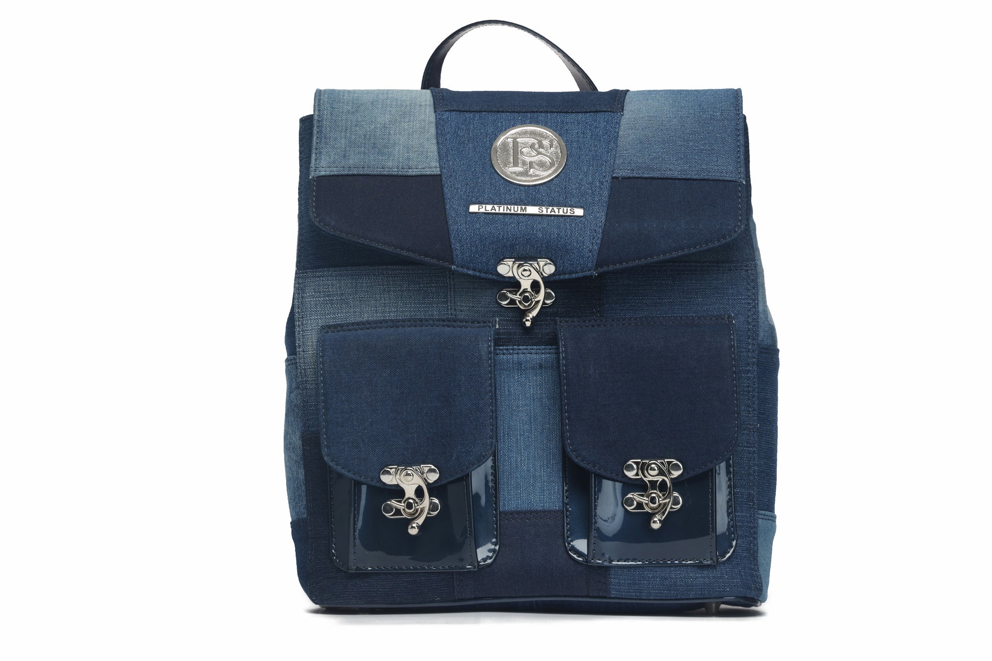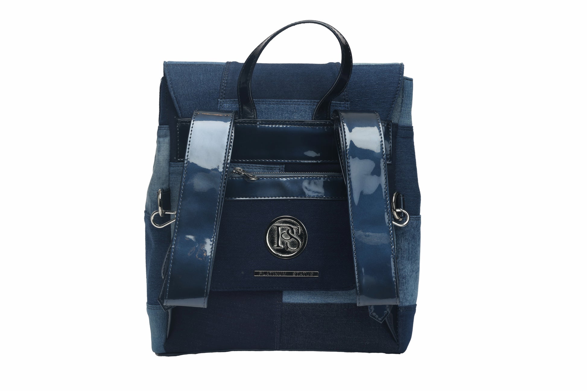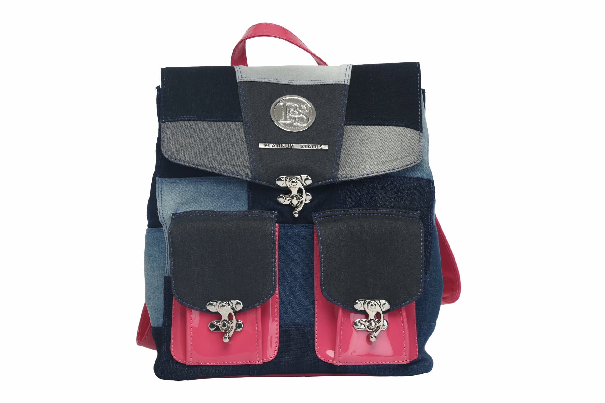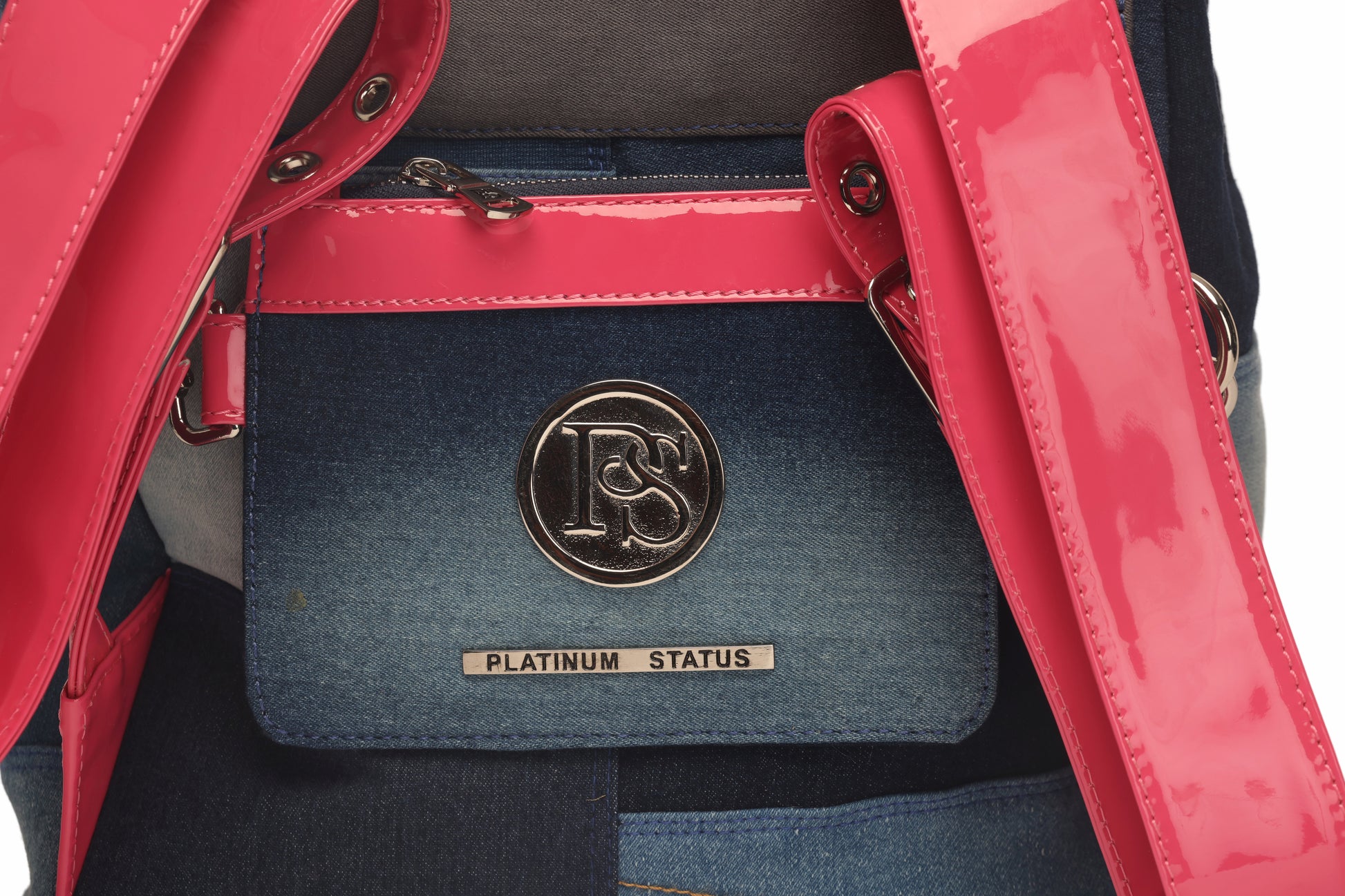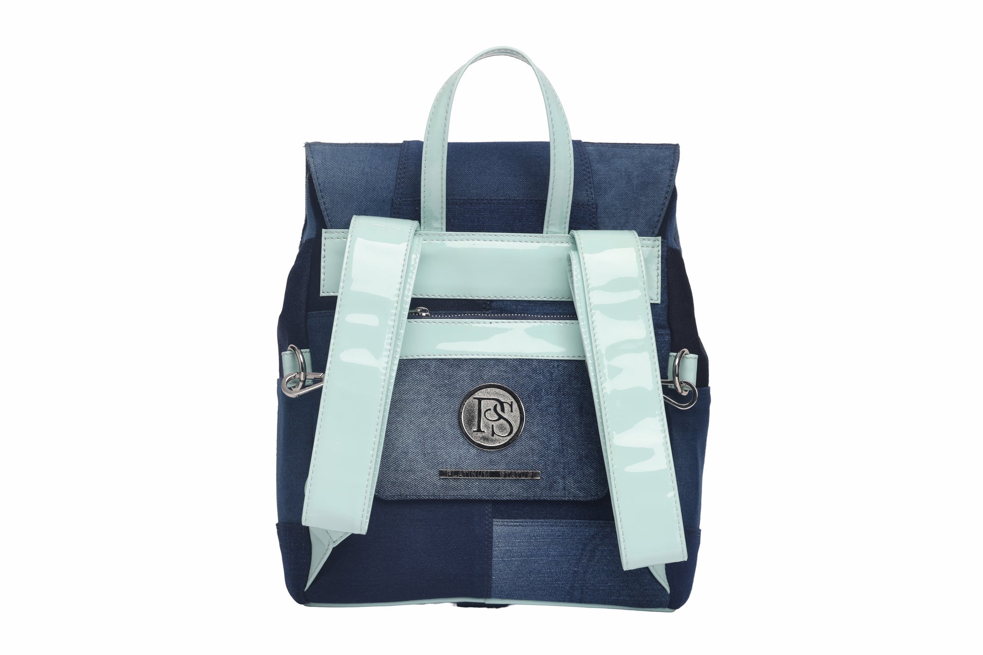 You will love this line made with recycled jean and patent leather straps, this bag comes muticolor with your choice of navy, powder blue, pink or black!